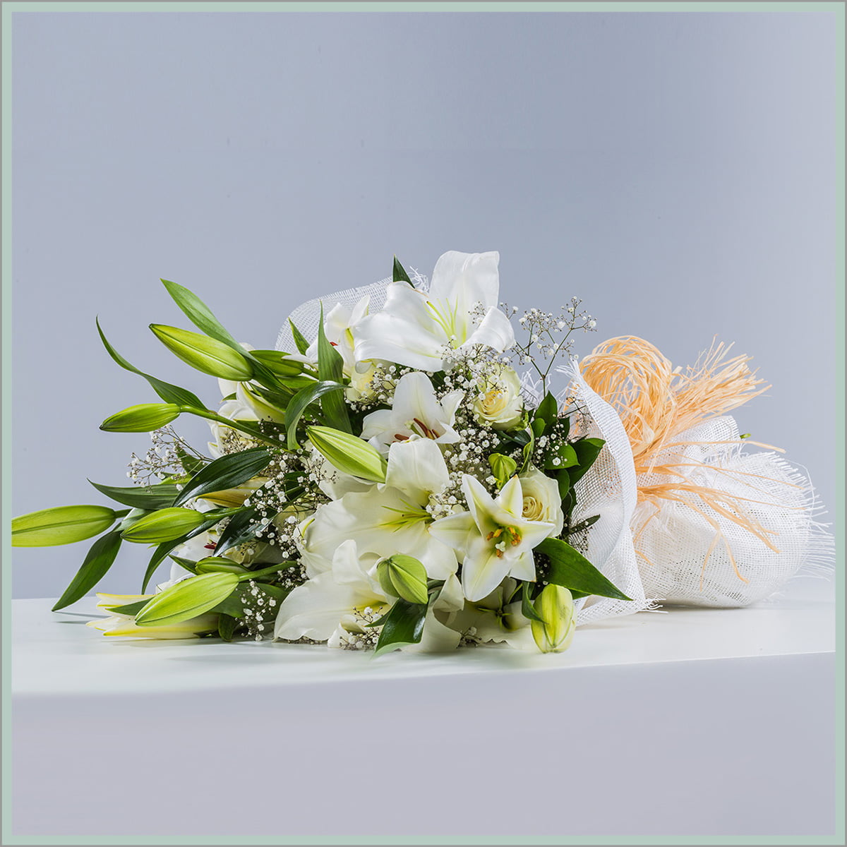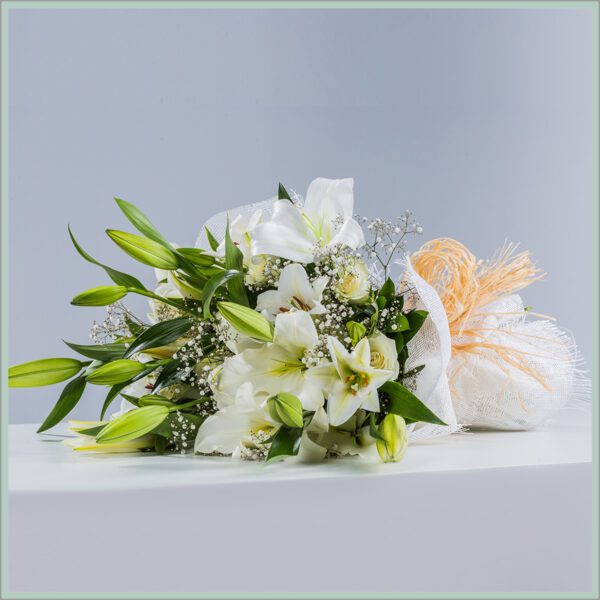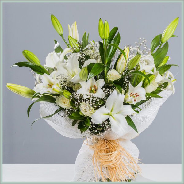 A timeless bouquet of pure white lilies, creamy roses, and delicate baby’s breath, arranged with fresh greenery for a soft, graceful finish. Wrapped in airy white mesh and tied with natural raffia, this bouquet blends elegance and simplicity in the most classic way. Perfect for sympathy, weddings, thank yous, congratulations, and any occasion that calls for beauty and purity.